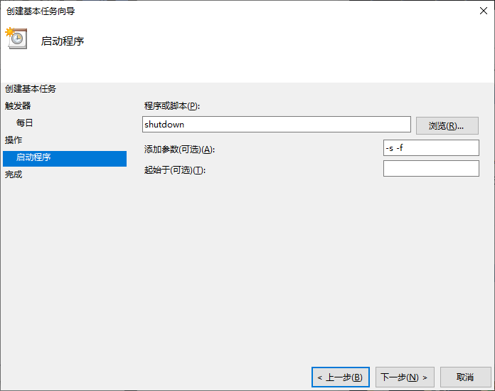 5. 在“程序或脚本”栏中填写 shutdown