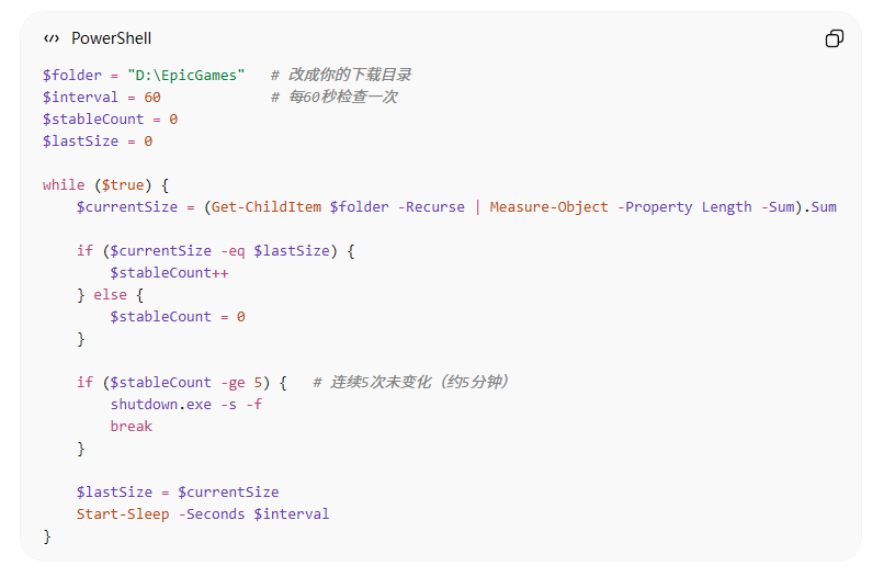 把需求和Epic实际下载路径发送给AI,让其生成PowerShell脚本,在本地保持脚本运行即可实现Epic下载完自动关机。