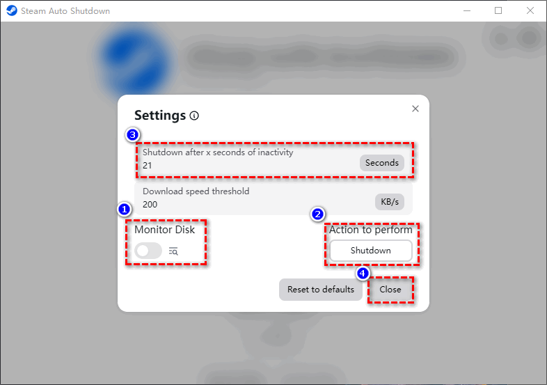 5. 点击“Close”关闭设置页面,在主页面开启功能即可设置Epic下载完自动关机(需保持该软件在后台运行)。