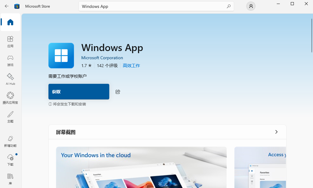 在Microsoft Store商店搜索安装Windows App,打开软件后,输入工作或学校账户及其他配置信息,即可远程桌面连接。