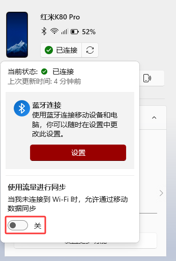 - 远程控制手机:点击手机状态栏中的“已连接”图标,打开“使用流量进行同步”,即可在跨网络/跨地域的情况下远程控制已绑定的手机设备(需手机授权,部分支持)。