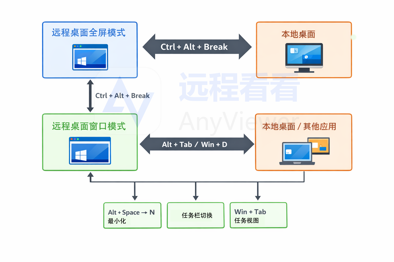 远程桌面全屏↔窗口↔本地桌面切换方法及流程图