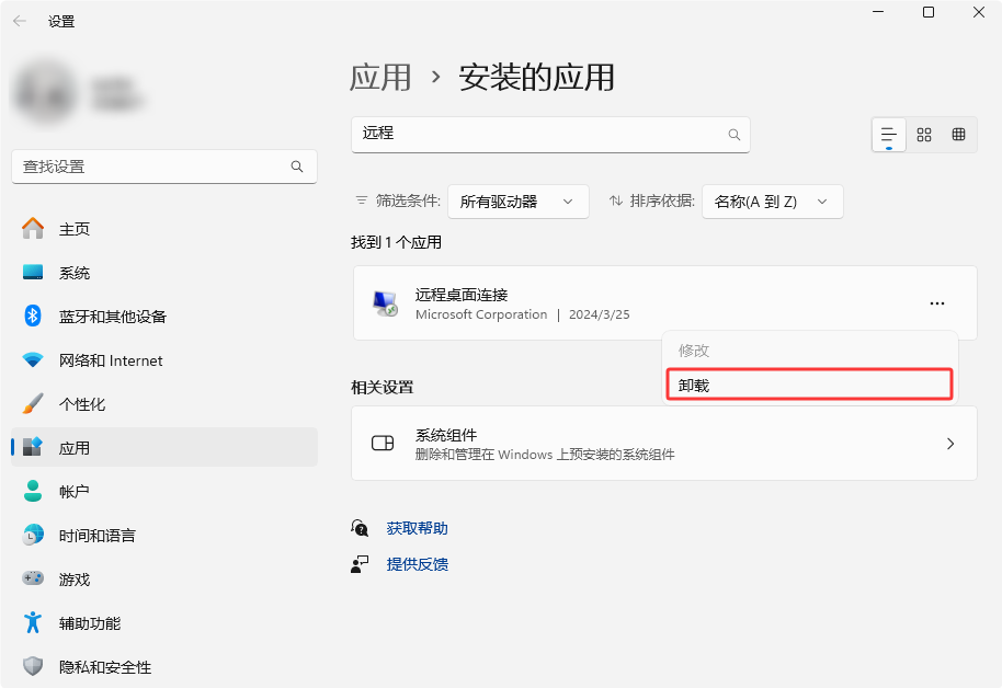 2. 查找或搜索 “远程桌面连接”,选择右侧的三个点,然后选择“卸载”;