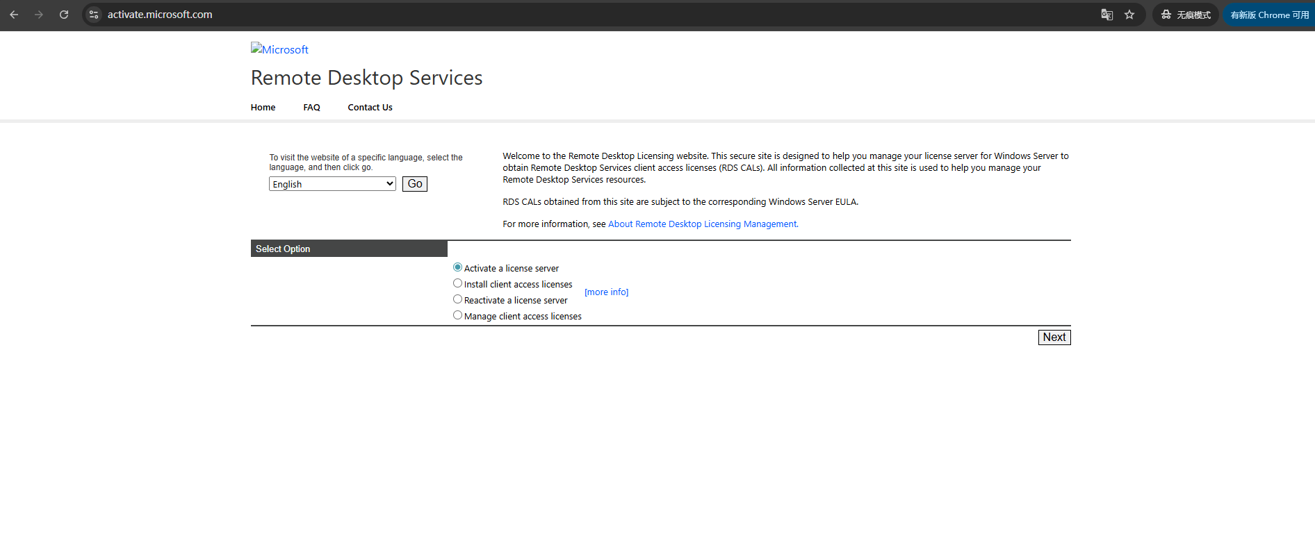 步骤2.选中未激活的服务器,右键单击“属性”,将连接方法选择为“web 浏览器”,记录下 20 位的产品 ID。访问https://activate.microsoft.com 进行注册申请授权,按要求填写信息,生成 35 位的“许可证服务器 ID”并记录下来。