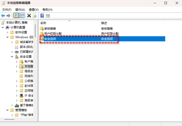 步骤2.打开本地组策略编辑器,找到计算机配置>Windows 设置 >安全设置> 本地策略 >安全选项,将“网络访问:本地账户的共享和安全模型”设置为“经典 - 对本地用户进行身份验证,不改变其本来身份”。