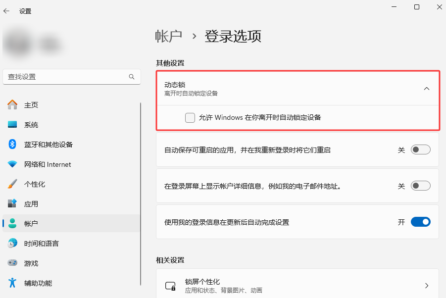 Win11:Win + I打开设置 > 账户 > 其他设置下的登录选项中开启“动态锁”